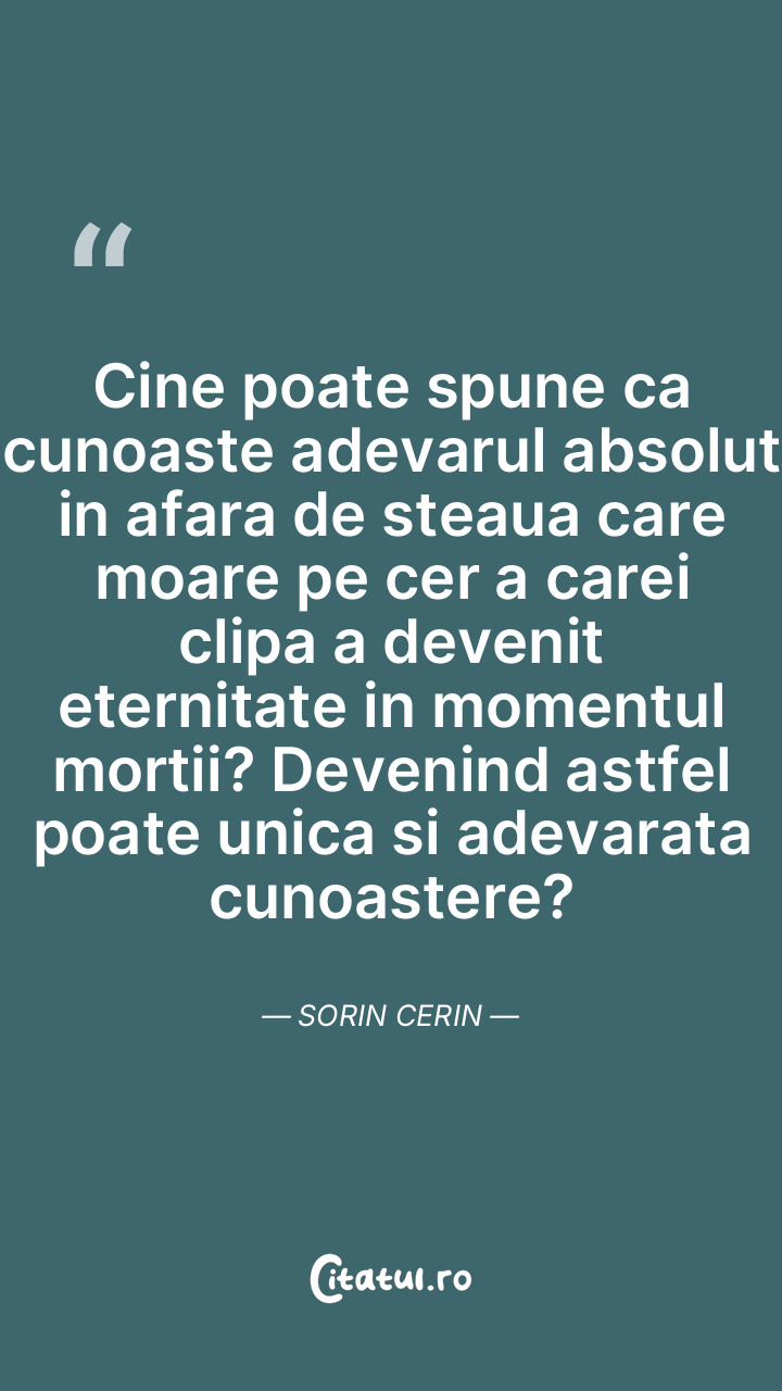 Cine poate spune ca cunoaste adevarul absolut in afara de steaua care moare pe cer a carei clipa a devenit eternitate in momentul mortii? Devenind astfel poate unica si adevarata cunoastere? Sorin Cerin