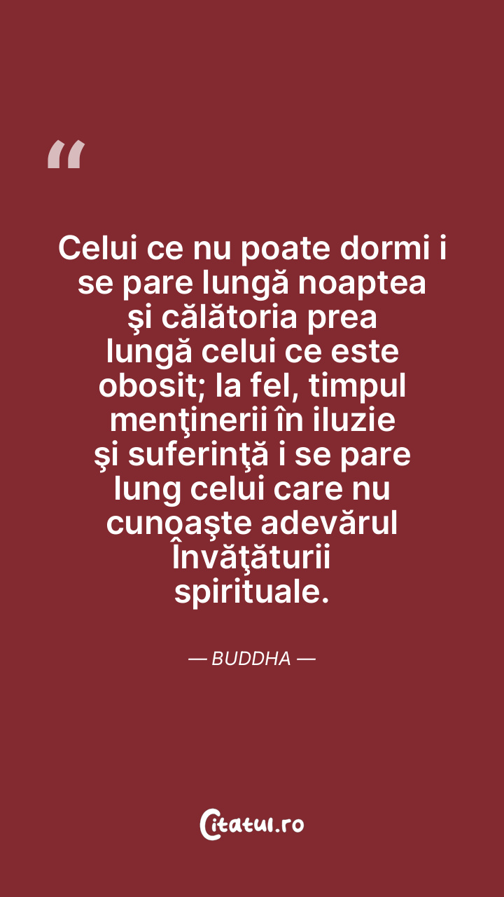 Celui ce nu poate dormi i se pare lungă noaptea şi călătoria prea lungă celui ce este obosit; la fel, timpul menţinerii în iluzie şi suferinţă i se pare lung celui care nu cunoaşte adevărul Învăţăturii spirituale. Buddha