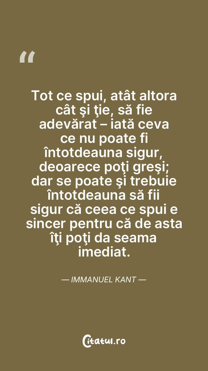 Tot ce spui, atât altora cât şi ţie, să fie adevărat – iată ceva ce nu poate fi întotdeauna sigur, deoarece poţi greşi; dar se poate şi trebuie întotdeauna să fii sigur că ceea ce spui e sincer pentru că de asta îţi poţi da seama imediat. Immanuel Kant