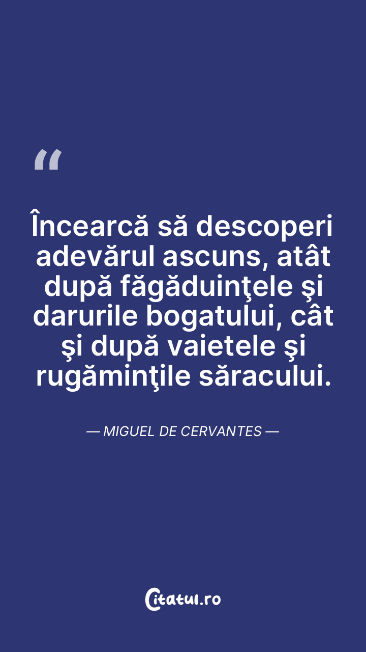 Încearcă să descoperi adevărul ascuns, atât după făgăduinţele şi darurile bogatului, cât şi după vaietele şi rugăminţile săracului. Miguel de Cervantes