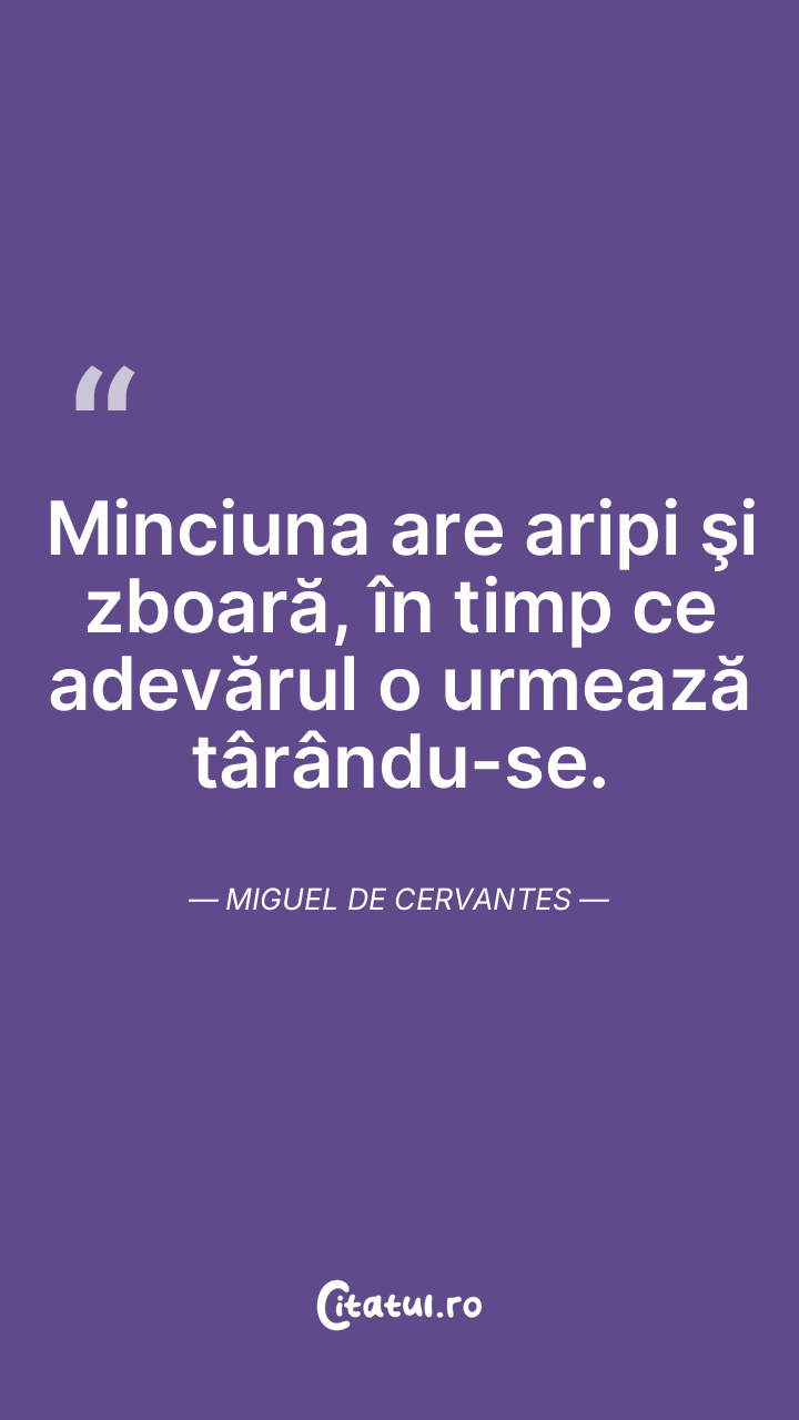 Minciuna are aripi şi zboară, în timp ce adevărul o urmează târându-se. Miguel de Cervantes