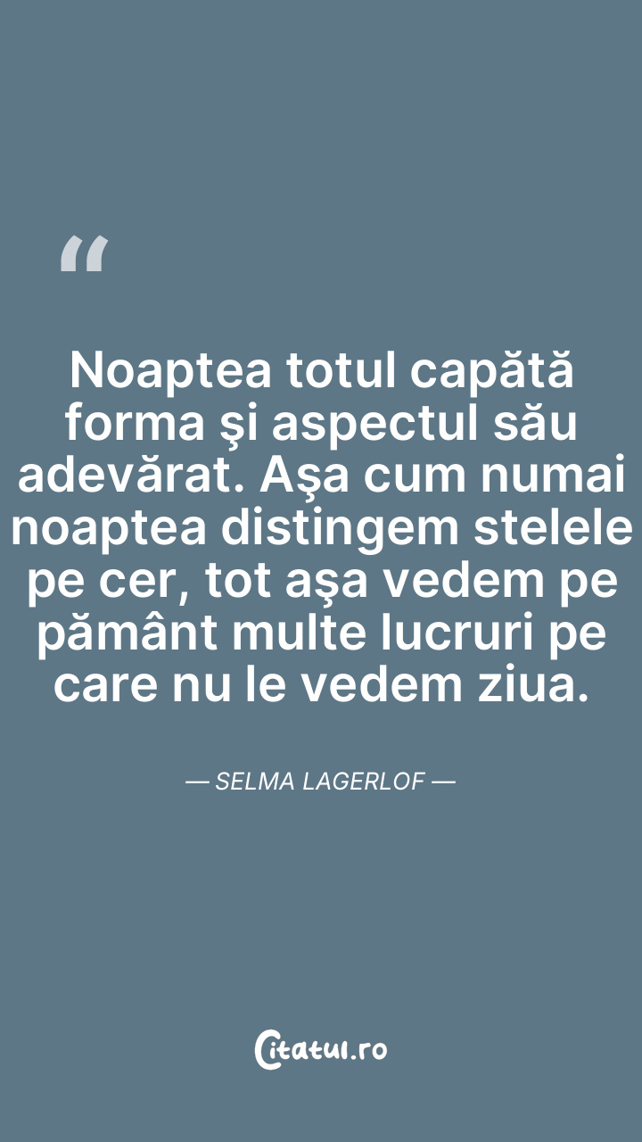 Noaptea totul capătă forma şi aspectul său adevărat. Aşa cum numai noaptea distingem stelele pe cer, tot aşa vedem pe pământ multe lucruri pe care nu le vedem ziua. Selma Lagerlof