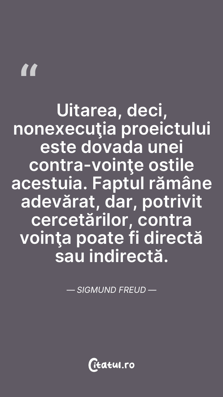 Uitarea, deci, nonexecuţia proeictului este dovada unei contra-voinţe ostile acestuia. Faptul rămâne adevărat, dar, potrivit cercetărilor, contra voinţa poate fi directă sau indirectă. Sigmund Freud