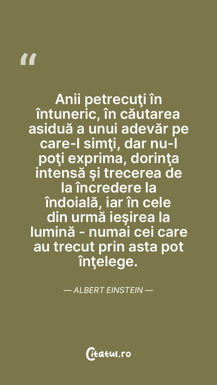 Anii petrecuţi în întuneric, în căutarea asiduă a unui adevăr pe care-l simţi, dar nu-l poţi exprima, dorinţa intensă şi trecerea de la încredere la îndoială, iar în cele din urmă ieşirea la lumină - numai cei care au trecut prin asta pot înţelege. Albert Einstein