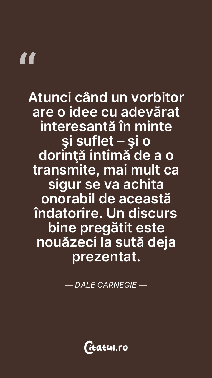 Atunci când un vorbitor are o idee cu adevărat interesantă în minte şi suflet – şi o dorinţă intimă de a o transmite, mai mult ca sigur se va achita onorabil de această îndatorire. Un discurs bine pregătit este nouăzeci la sută deja prezentat. Dale Carnegie