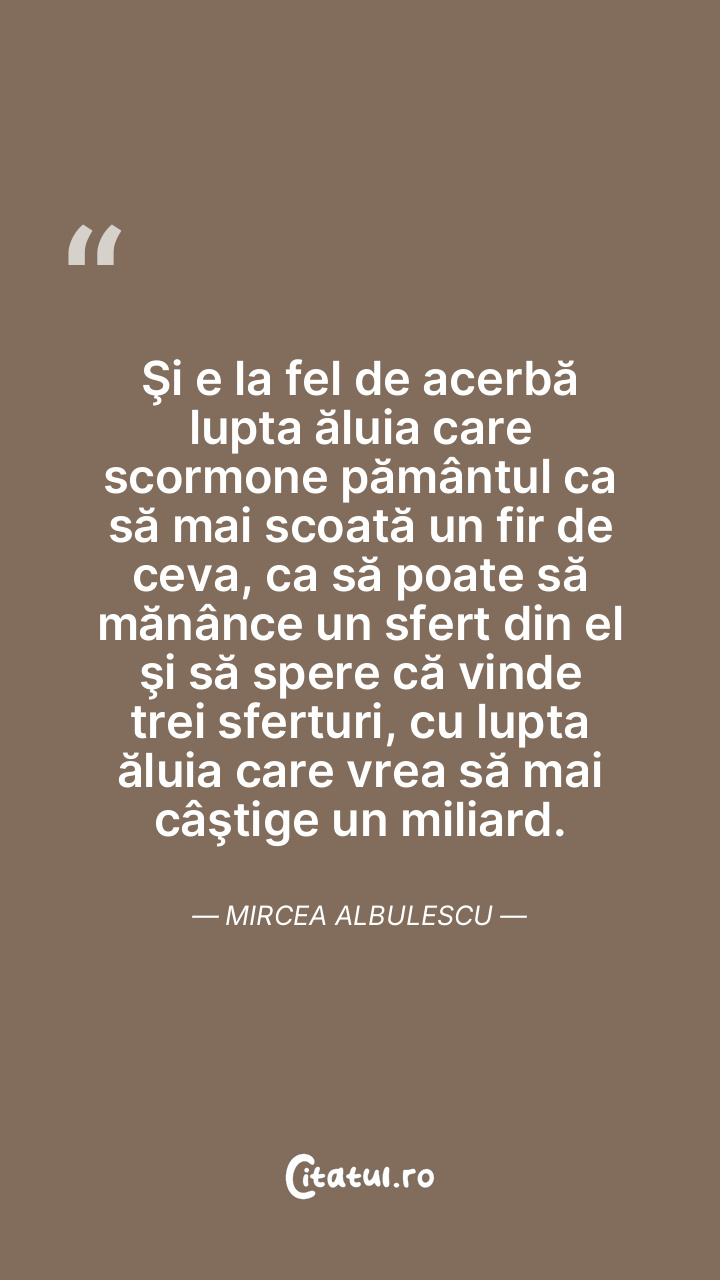 Şi e la fel de acerbă lupta ăluia care scormone pământul ca să mai scoată un fir de ceva, ca să poate să mănânce un sfert din el şi să spere că vinde trei sferturi, cu lupta ăluia care vrea să mai câştige un miliard. Mircea Albulescu