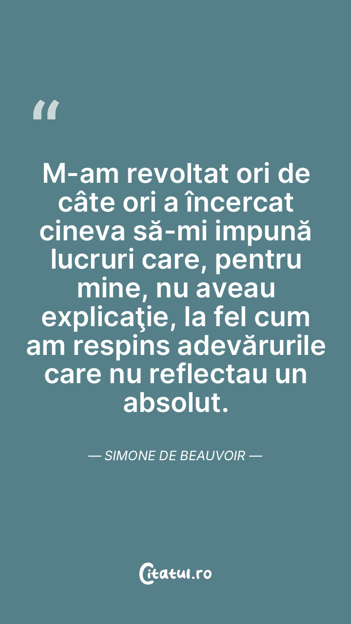 M-am revoltat ori de câte ori a încercat cineva să-mi impună lucruri care, pentru mine, nu aveau explicaţie, la fel cum am respins adevărurile care nu reflectau un absolut. Simone de Beauvoir