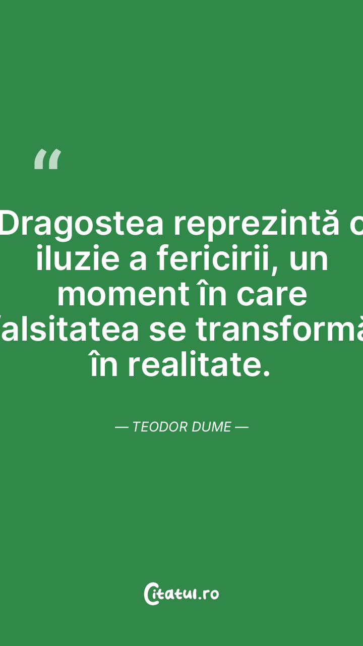 Dragostea reprezintă o iluzie a fericirii, un moment în care falsitatea se transformă în realitate. Teodor Dume