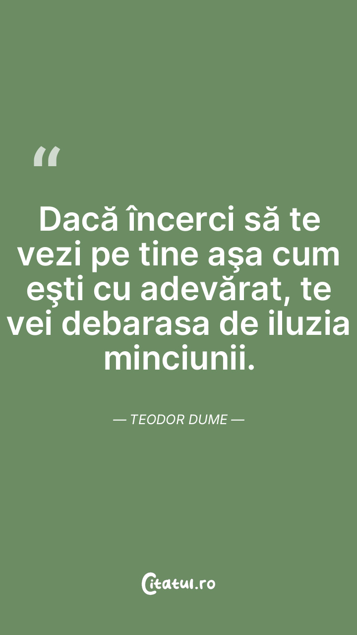 Dacă încerci să te vezi pe tine aşa cum eşti cu adevărat, te vei debarasa de iluzia minciunii. Teodor Dume