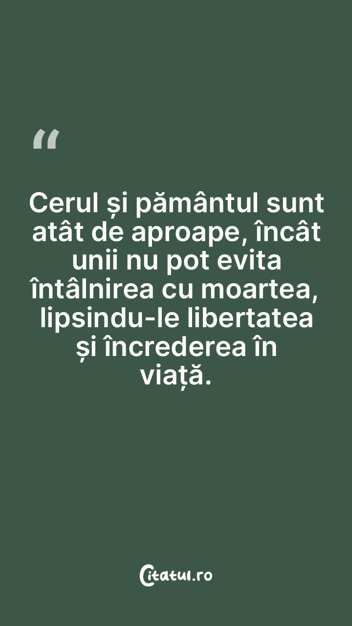 Cerul și pământul sunt atât de aproape, încât unii nu pot evita întâlnirea cu moartea, lipsindu-le libertatea și încrederea în viață.