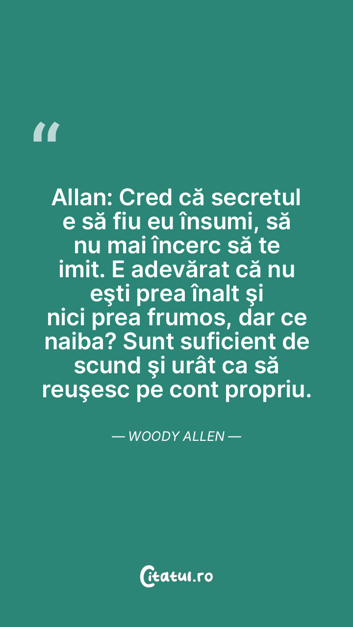 Allan: Cred că secretul e să fiu eu însumi, să nu mai încerc să te imit. E adevărat că nu eşti prea înalt şi nici prea frumos, dar ce naiba? Sunt suficient de scund şi urât ca să reuşesc pe cont propriu. Woody Allen