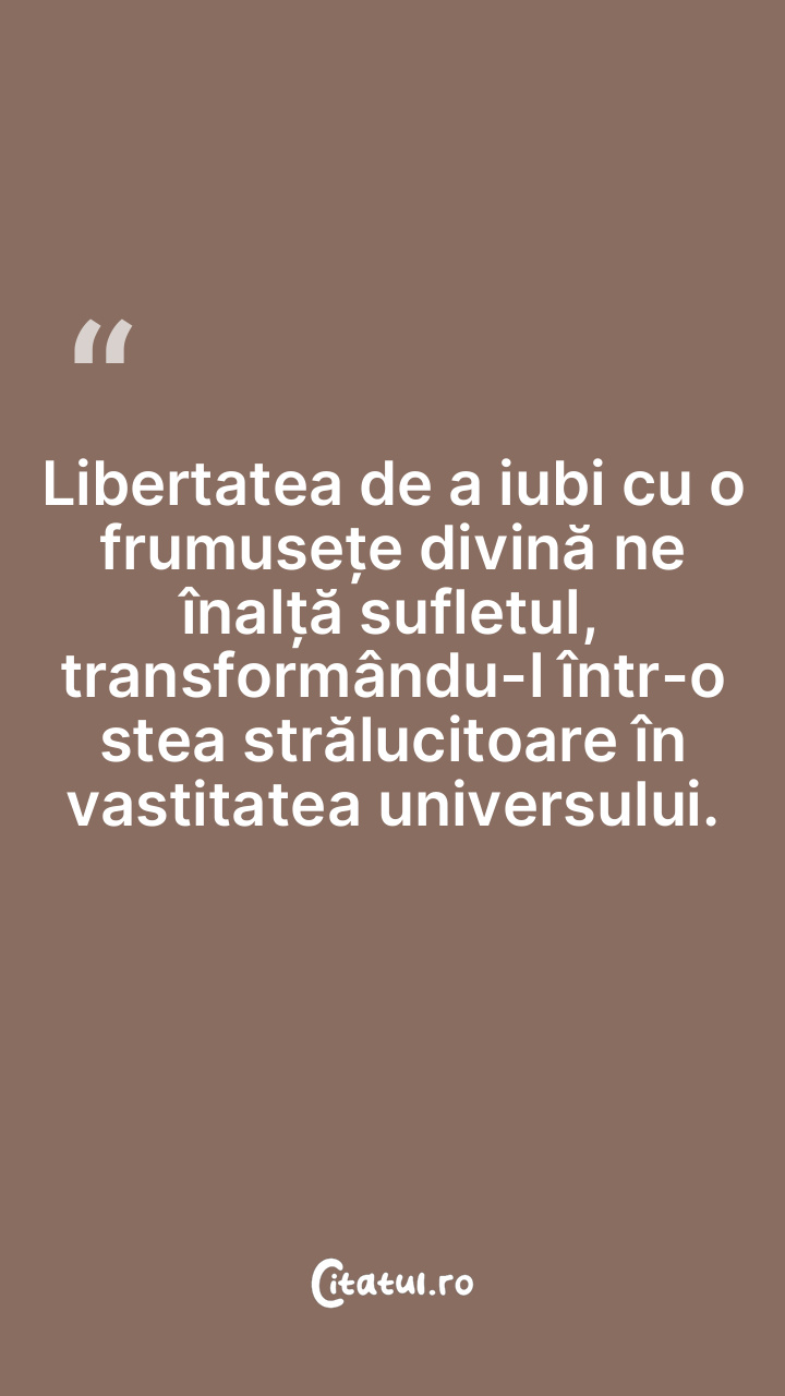 Libertatea de a iubi cu o frumusețe divină ne înalță sufletul, transformându-l într-o stea strălucitoare în vastitatea universului.