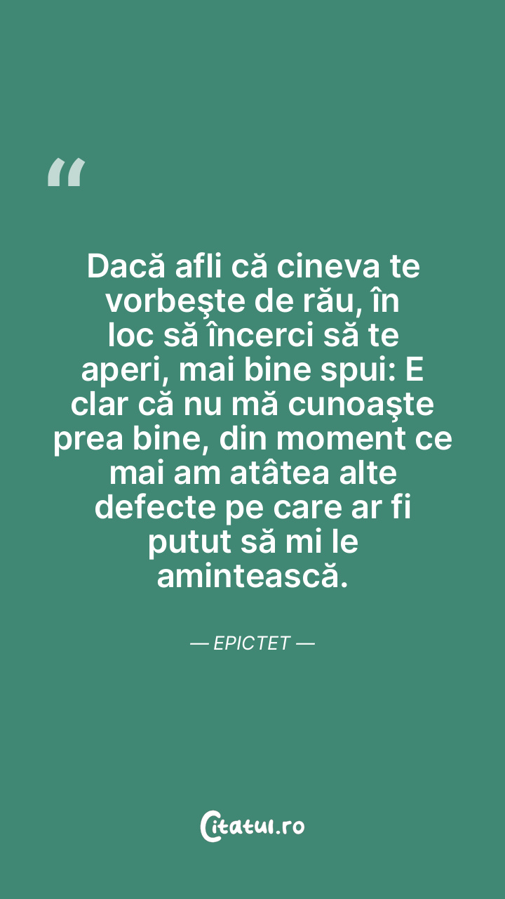 Dacă afli că cineva te vorbeşte de rău, în loc să încerci să te aperi, mai bine spui: E clar că nu mă cunoaşte prea bine, din moment ce mai am atâtea alte defecte pe care ar fi putut să mi le amintească. Epictet