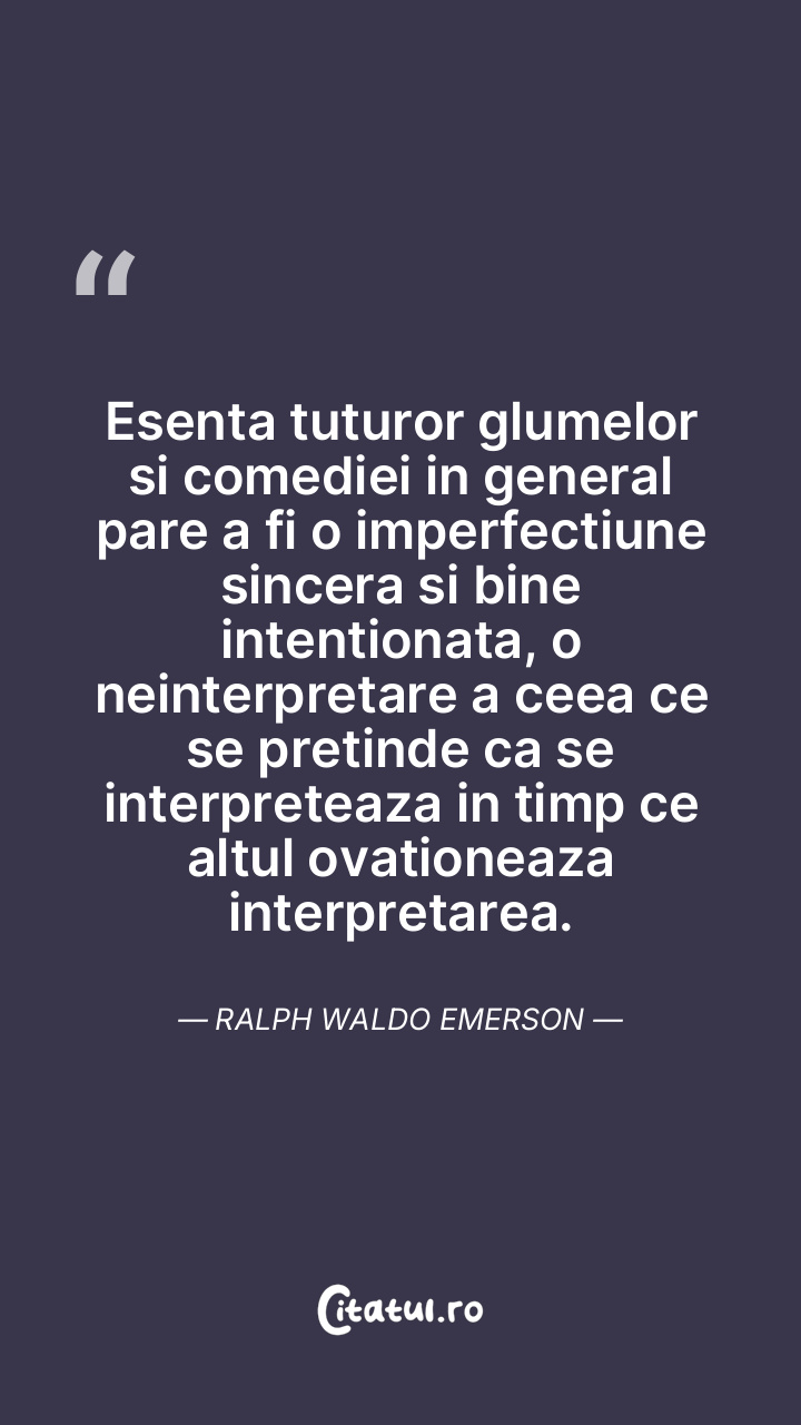 Esenta tuturor glumelor si comediei in general pare a fi o imperfectiune sincera si bine intentionata, o neinterpretare a ceea ce se pretinde ca se interpreteaza in timp ce altul ovationeaza interpretarea. Ralph Waldo Emerson