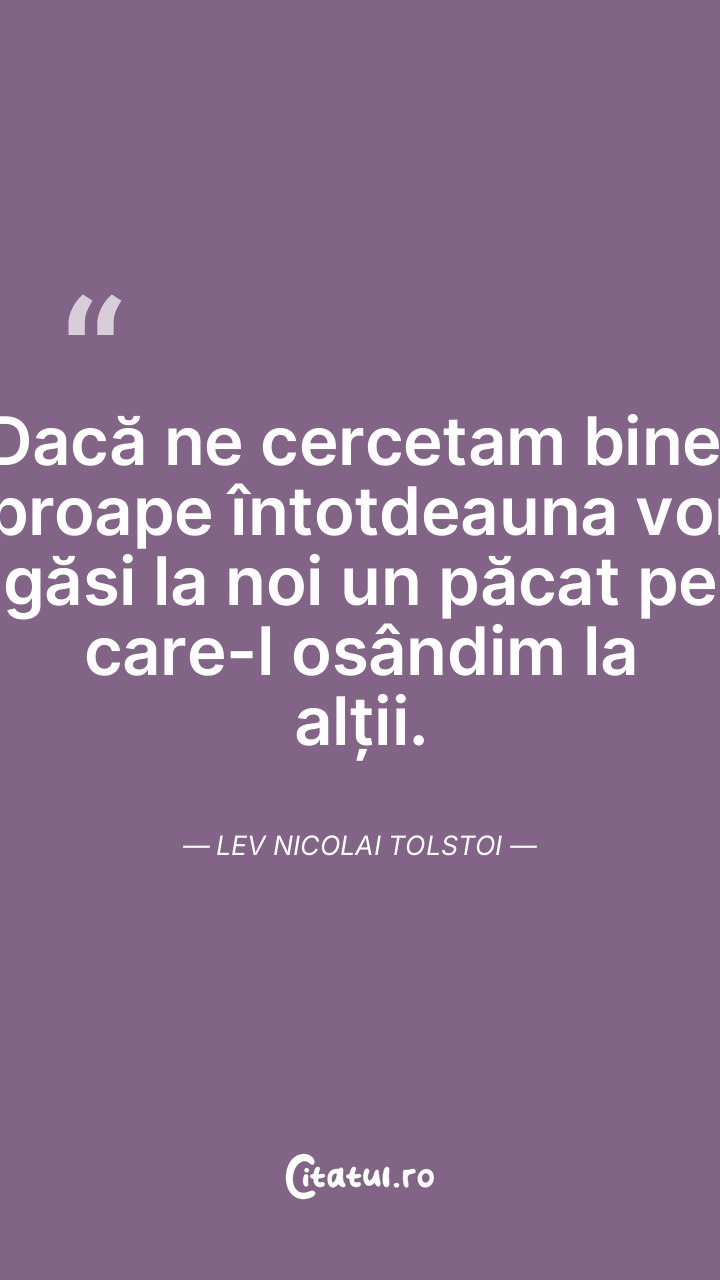Dacă ne cercetam bine, aproape întotdeauna vom găsi la noi un păcat pe care-l osândim la alții. Lev Nicolai Tolstoi