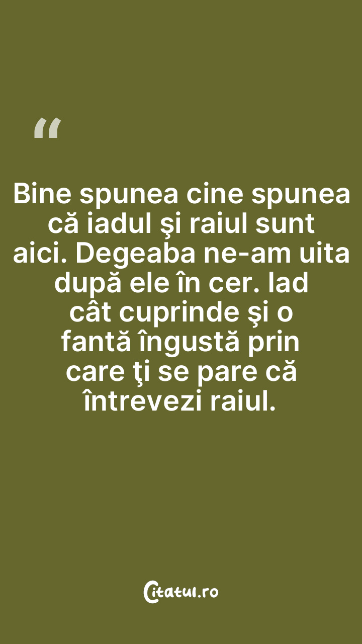 Bine spunea cine spunea că iadul şi raiul sunt aici. Degeaba ne-am uita după ele în cer. Iad cât cuprinde şi o fantă îngustă prin care ţi se pare că întrevezi raiul.