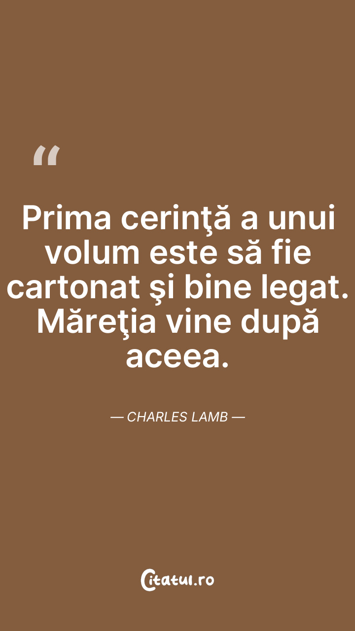Prima cerinţă a unui volum este să fie cartonat şi bine legat. Măreţia vine după aceea. Charles Lamb