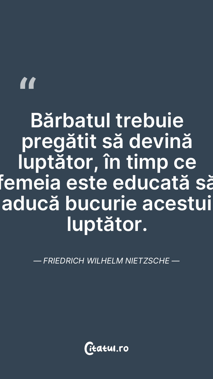 Bărbatul trebuie pregătit să devină luptător, în timp ce femeia este educată să aducă bucurie acestui luptător. Friedrich Wilhelm Nietzsche
