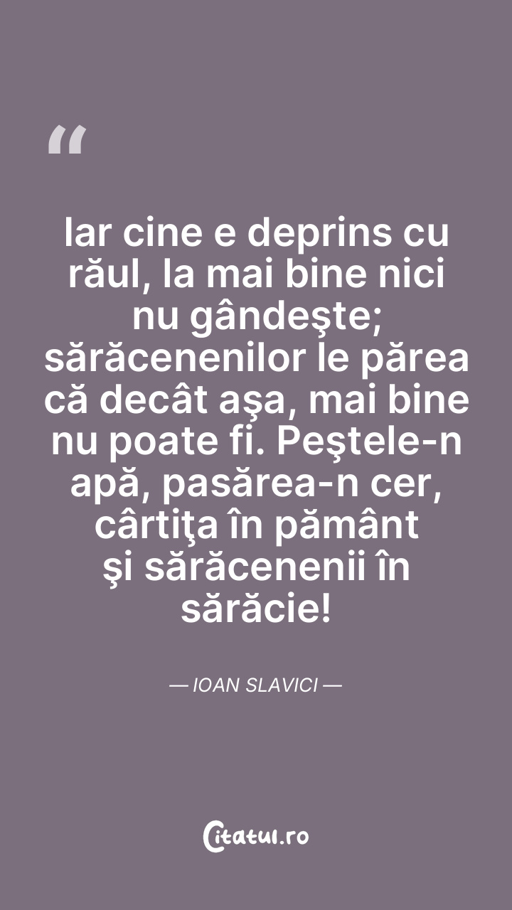 Iar cine e deprins cu răul, la mai bine nici nu gândeşte; sărăcenenilor le părea că decât aşa, mai bine nu poate fi. Peştele-n apă, pasărea-n cer, cârtiţa în pământ şi sărăcenenii în sărăcie! Ioan Slavici