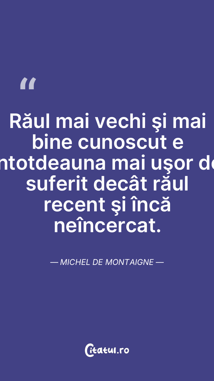Răul mai vechi şi mai bine cunoscut e întotdeauna mai uşor de suferit decât răul recent şi încă neîncercat. Michel de Montaigne