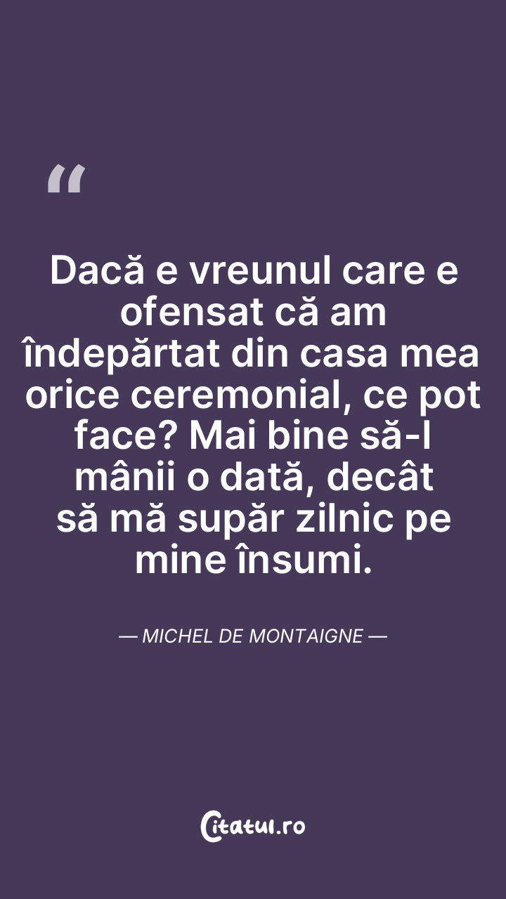 Dacă e vreunul care e ofensat că am îndepărtat din casa mea orice ceremonial, ce pot face? Mai bine să-l mânii o dată, decât să mă supăr zilnic pe mine însumi. Michel de Montaigne