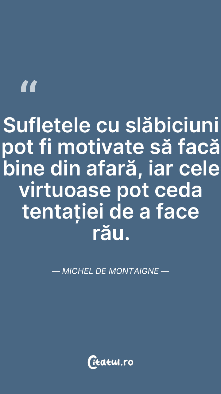Sufletele cu slăbiciuni pot fi motivate să facă bine din afară, iar cele virtuoase pot ceda tentației de a face rău. Michel de Montaigne
