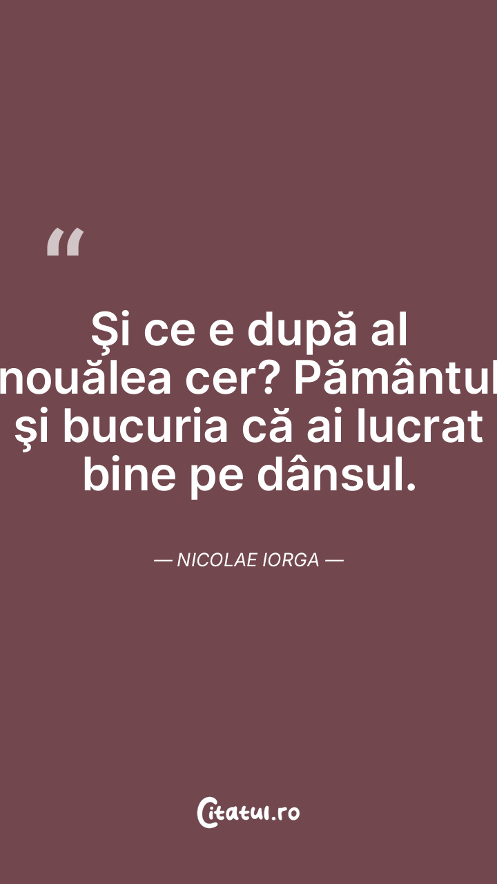 Şi ce e după al nouălea cer? Pământul şi bucuria că ai lucrat bine pe dânsul. Nicolae Iorga