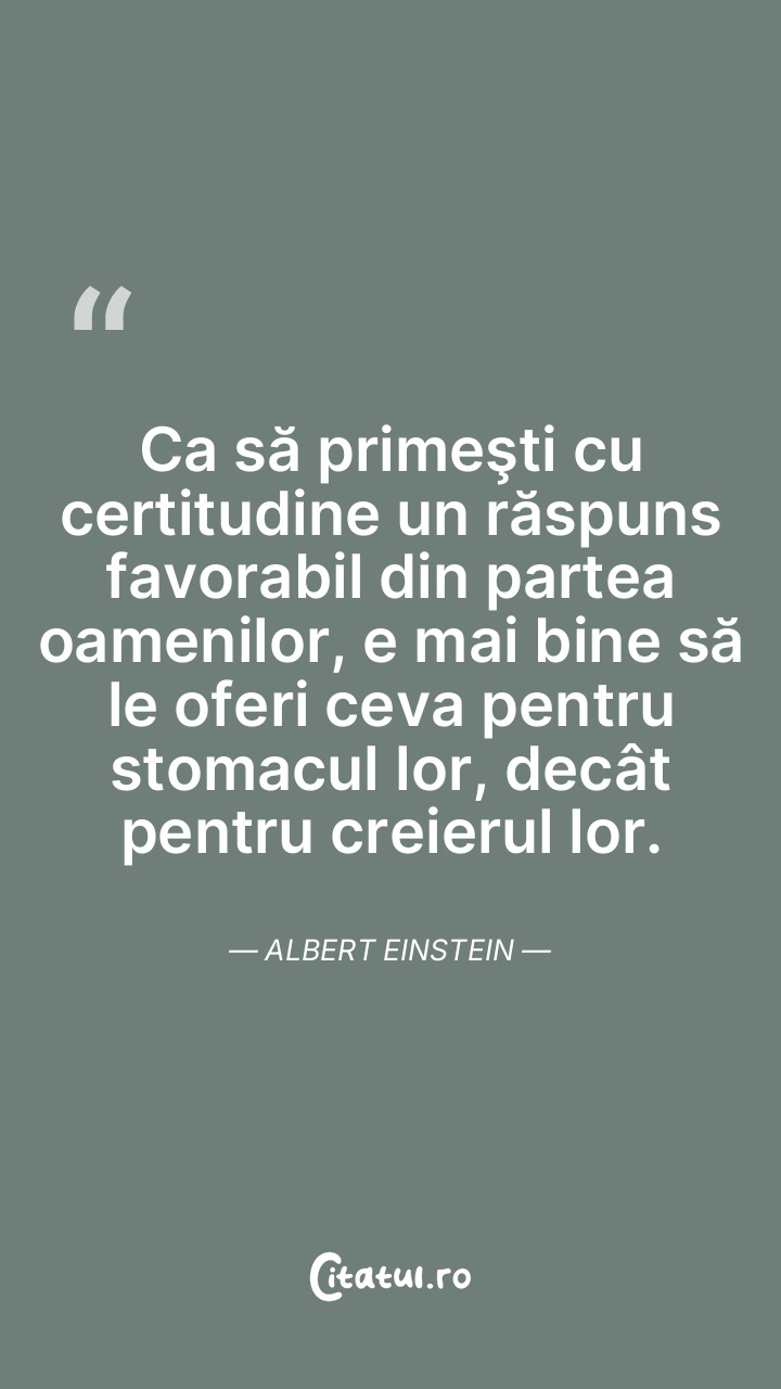 Ca să primeşti cu certitudine un răspuns favorabil din partea oamenilor, e mai bine să le oferi ceva pentru stomacul lor, decât pentru creierul lor. Albert Einstein