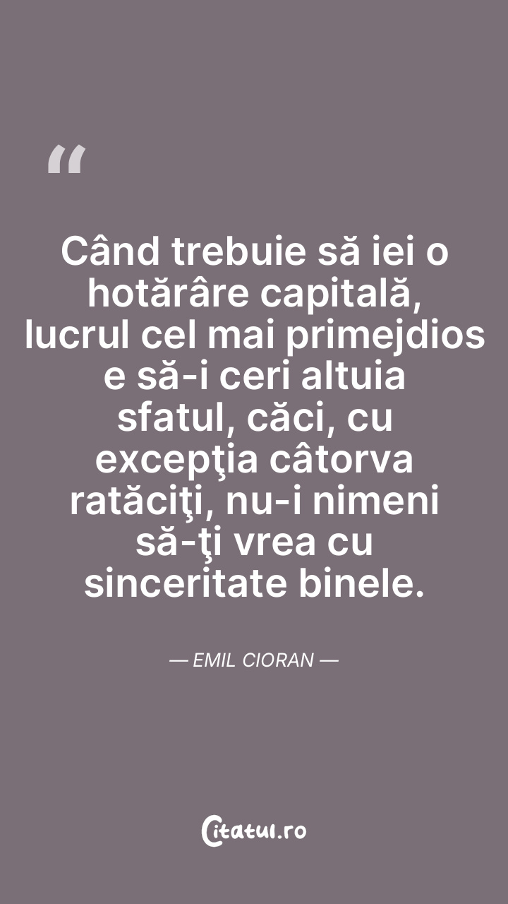 Când trebuie să iei o hotărâre capitală, lucrul cel mai primejdios e să-i ceri altuia sfatul, căci, cu excepţia câtorva ratăciţi, nu-i nimeni să-ţi vrea cu sinceritate binele. Emil Cioran