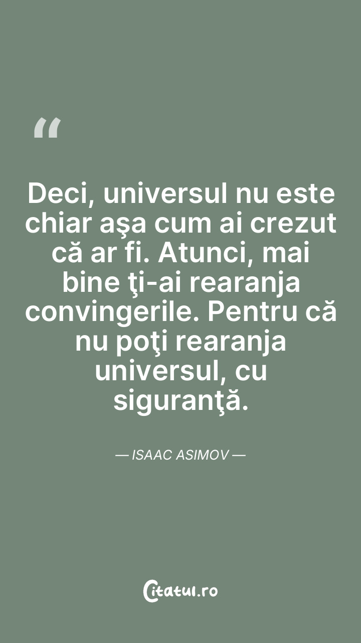 Deci, universul nu este chiar aşa cum ai crezut că ar fi. Atunci, mai bine ţi-ai rearanja convingerile. Pentru că nu poţi rearanja universul, cu siguranţă. Isaac Asimov