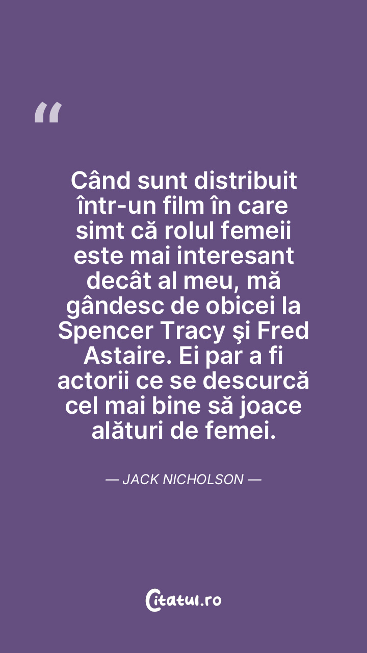 Când sunt distribuit într-un film în care simt că rolul femeii este mai interesant decât al meu, mă gândesc de obicei la Spencer Tracy şi Fred Astaire. Ei par a fi actorii ce se descurcă cel mai bine să joace alături de femei. Jack Nicholson