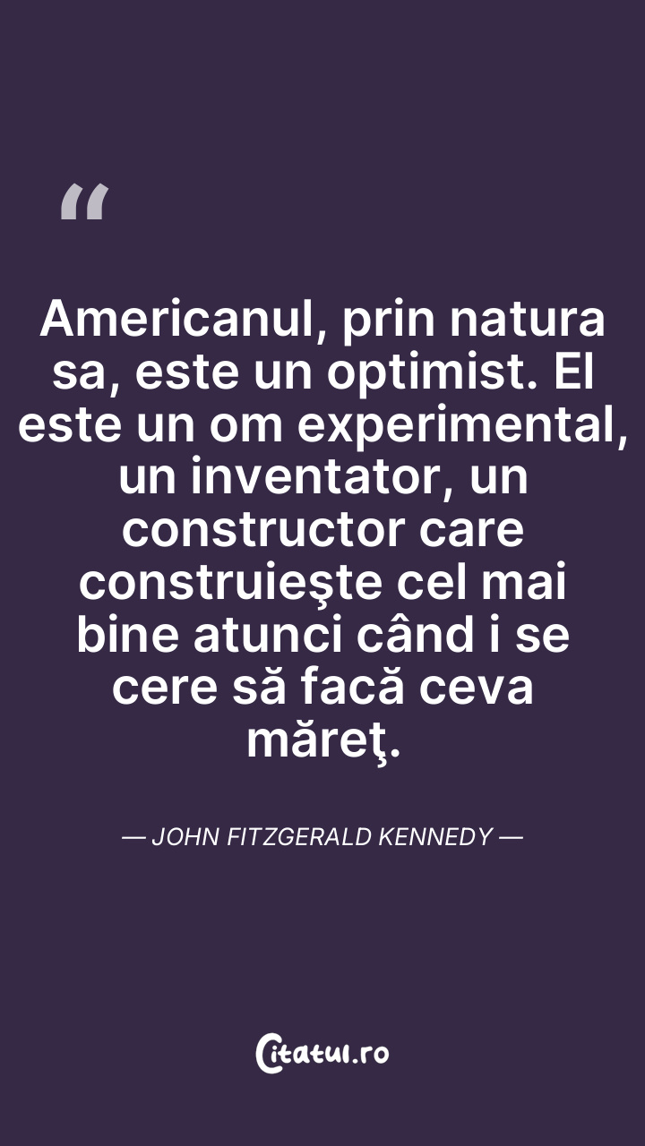 Americanul, prin natura sa, este un optimist. El este un om experimental, un inventator, un constructor care construieşte cel mai bine atunci când i se cere să facă ceva măreţ. John Fitzgerald Kennedy