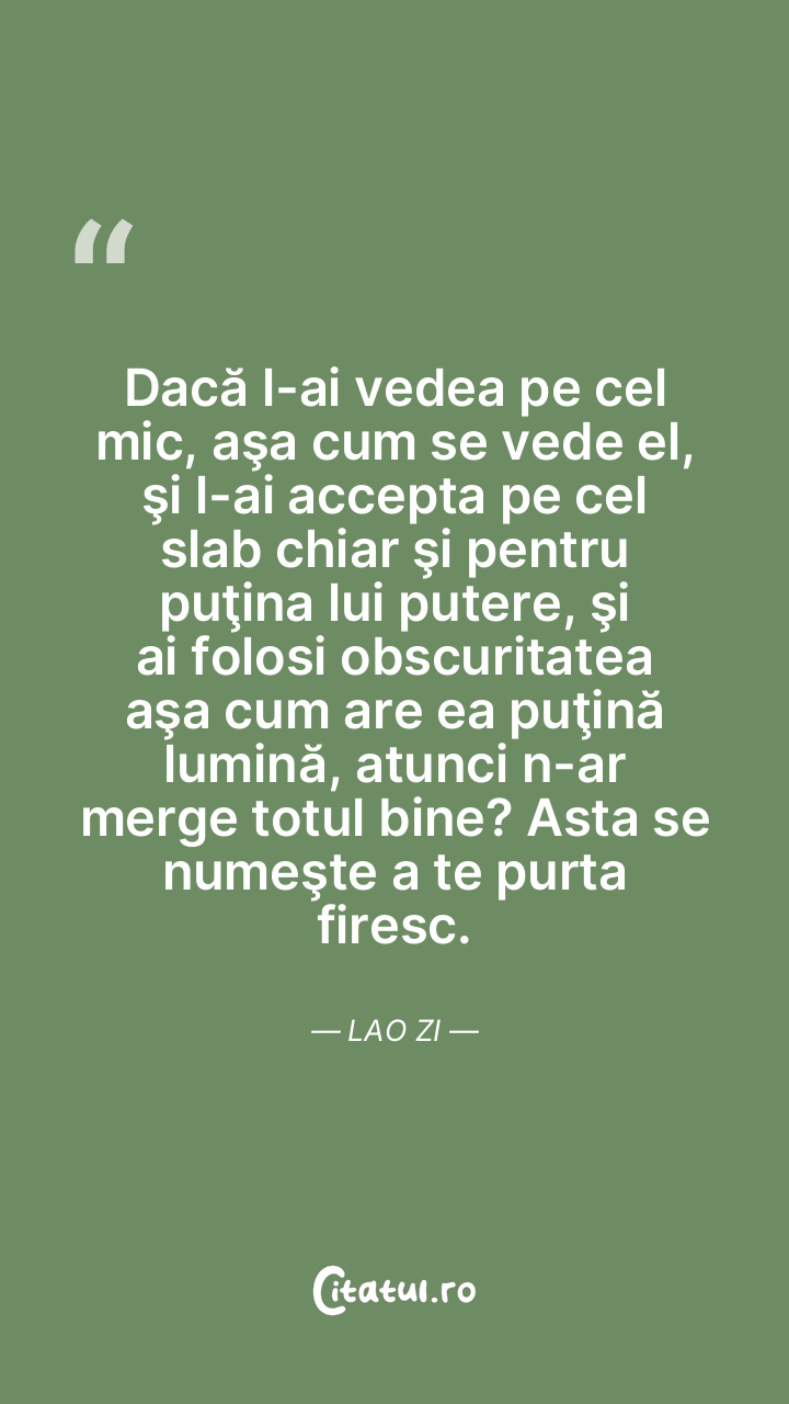 Dacă l-ai vedea pe cel mic, aşa cum se vede el, şi l-ai accepta pe cel slab chiar şi pentru puţina lui putere, şi ai folosi obscuritatea aşa cum are ea puţină lumină, atunci n-ar merge totul bine? Asta se numeşte a te purta firesc. Lao Zi