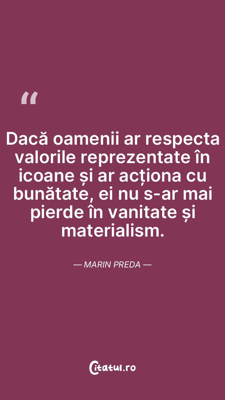 Dacă oamenii ar respecta valorile reprezentate în icoane și ar acționa cu bunătate, ei nu s-ar mai pierde în vanitate și materialism. Marin Preda