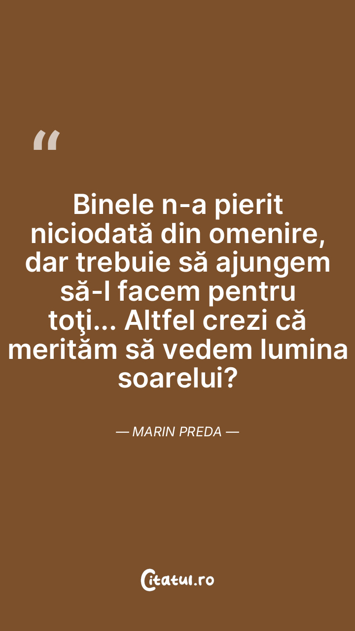 Binele n-a pierit niciodată din omenire, dar trebuie să ajungem să-l facem pentru toţi... Altfel crezi că merităm să vedem lumina soarelui? Marin Preda