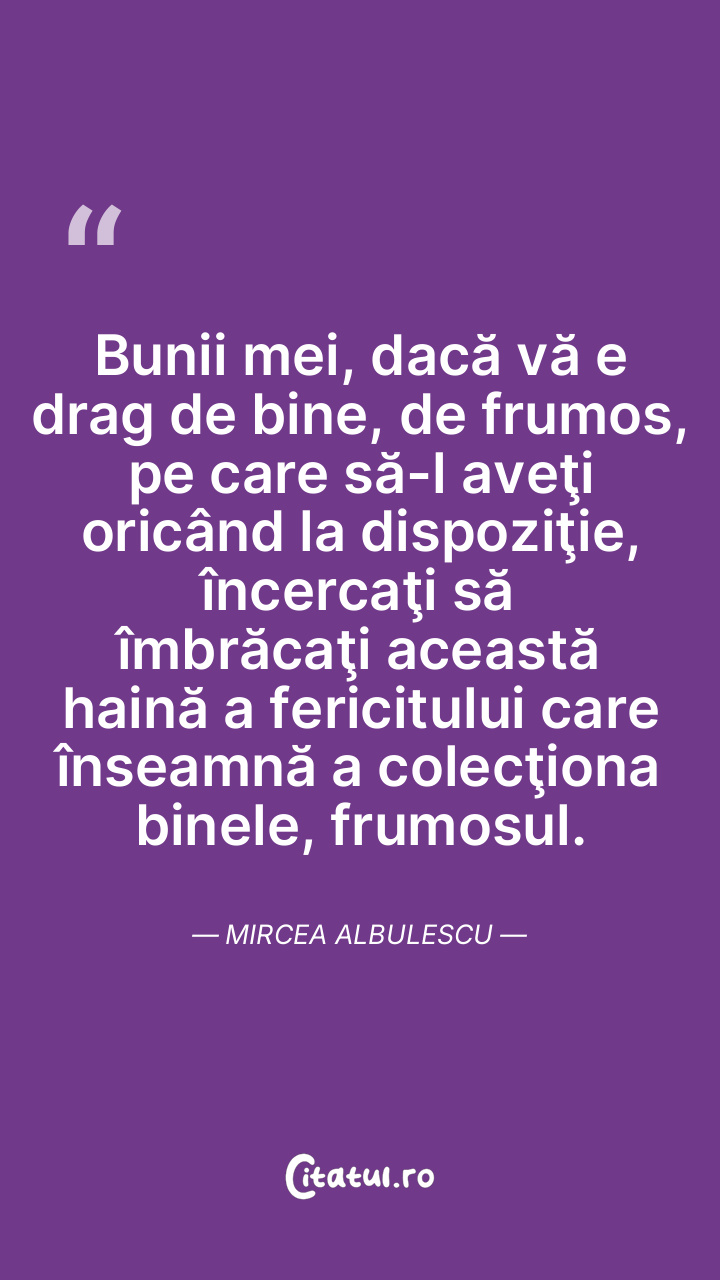 Bunii mei, dacă vă e drag de bine, de frumos, pe care să-l aveţi oricând la dispoziţie, încercaţi să îmbrăcaţi această haină a fericitului care înseamnă a colecţiona binele, frumosul. Mircea Albulescu