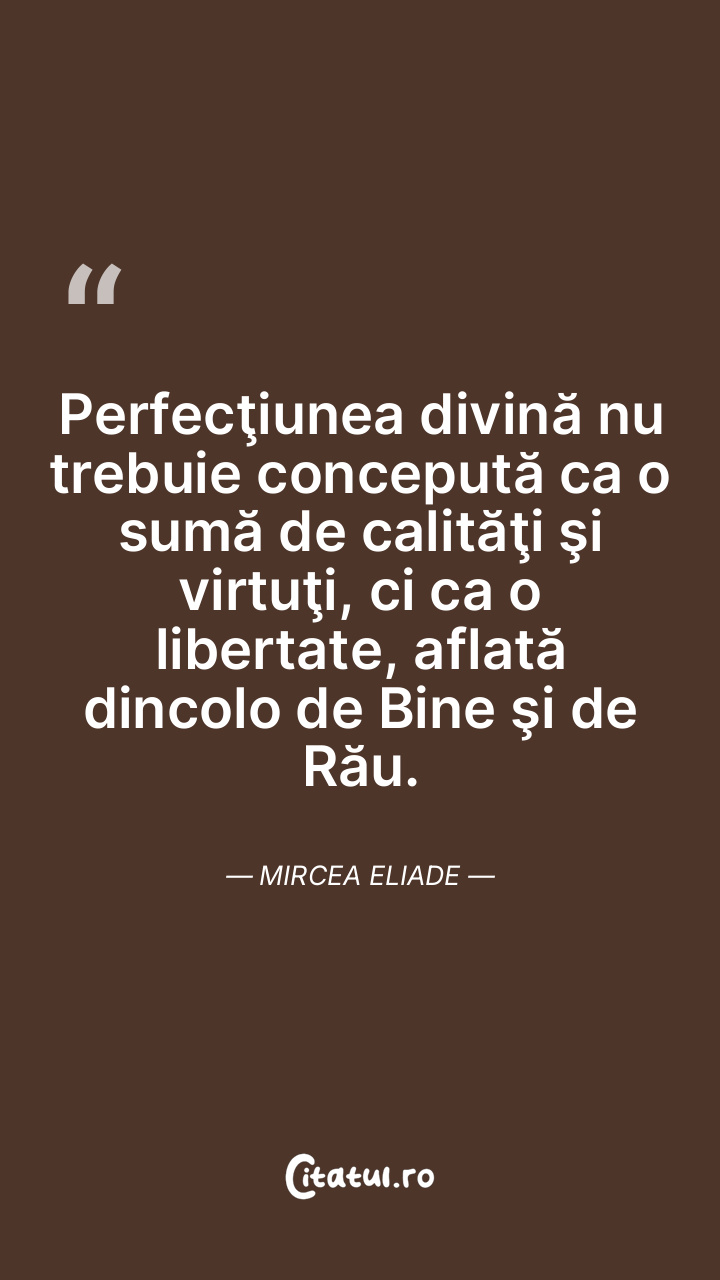 Perfecţiunea divină nu trebuie concepută ca o sumă de calităţi şi virtuţi, ci ca o libertate, aflată dincolo de Bine şi de Rău. Mircea Eliade