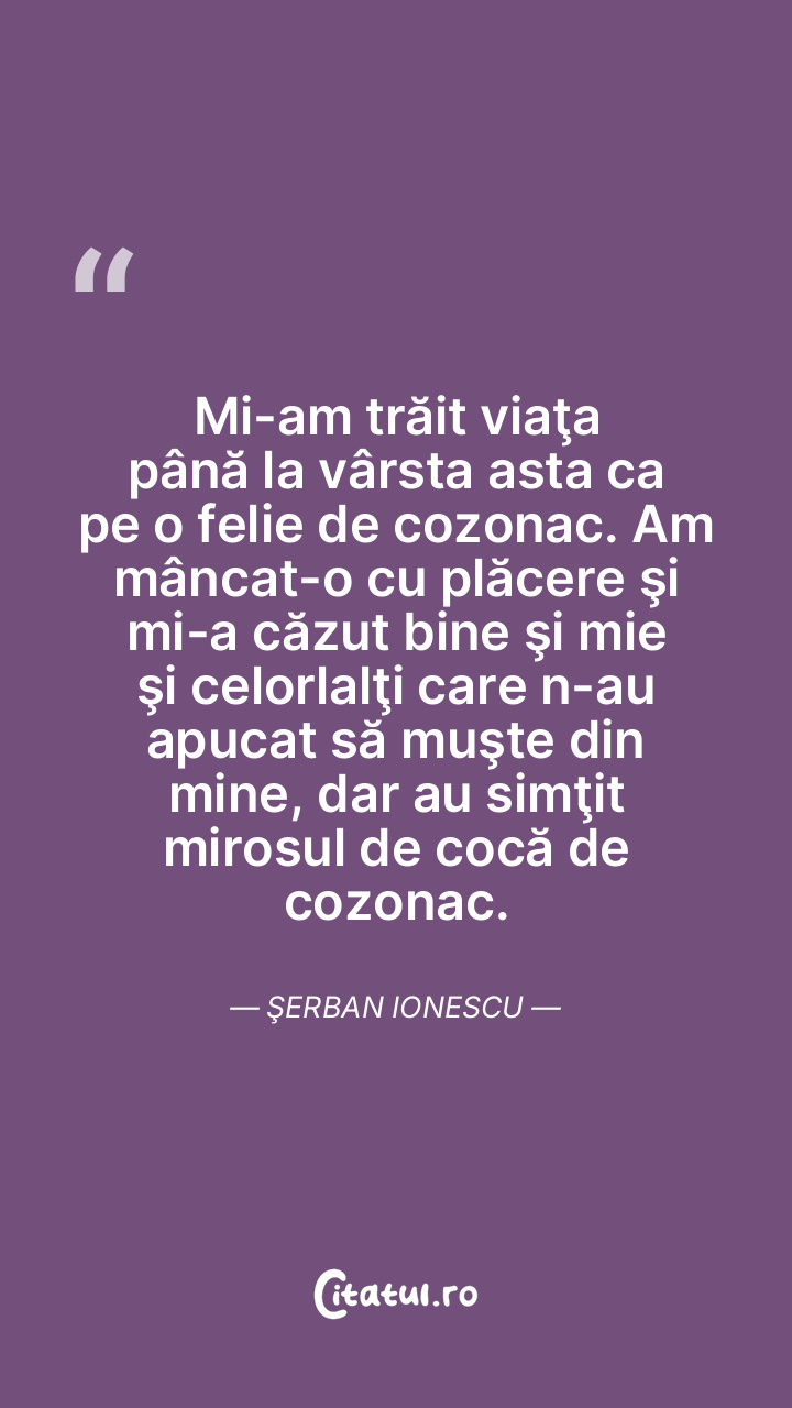 Mi-am trăit viaţa până la vârsta asta ca pe o felie de cozonac. Am mâncat-o cu plăcere şi mi-a căzut bine şi mie şi celorlalţi care n-au apucat să muşte din mine, dar au simţit mirosul de cocă de cozonac. Şerban Ionescu