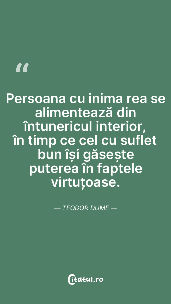 Persoana cu inima rea se alimentează din întunericul interior, în timp ce cel cu suflet bun își găsește puterea în faptele virtuțoase. Teodor Dume