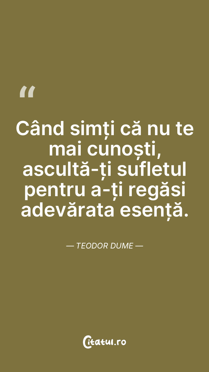 Când simți că nu te mai cunoști, ascultă-ți sufletul pentru a-ți regăsi adevărata esență. Teodor Dume