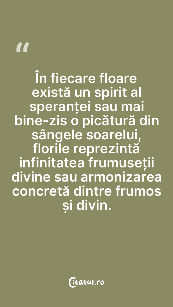 În fiecare floare există un spirit al speranței sau mai bine-zis o picătură din sângele soarelui, florile reprezintă infinitatea frumuseții divine sau armonizarea concretă dintre frumos și divin.
