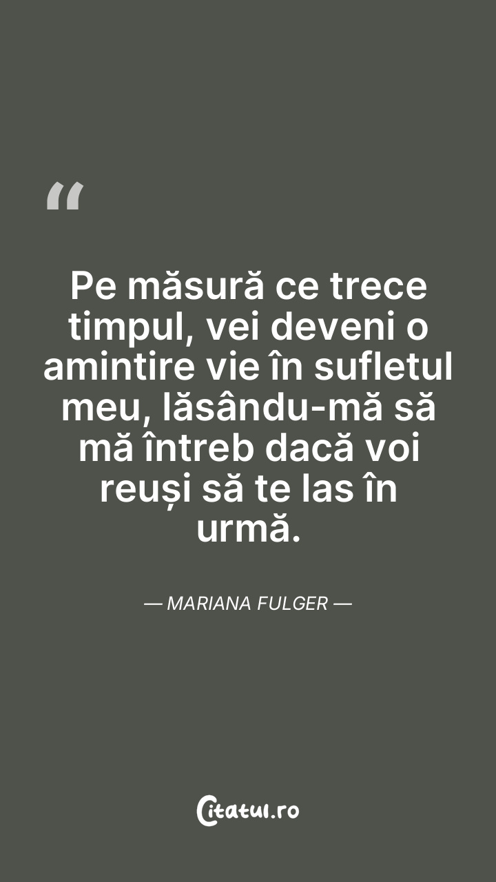 Pe măsură ce trece timpul, vei deveni o amintire vie în sufletul meu, lăsându-mă să mă întreb dacă voi reuși să te las în urmă. Mariana Fulger