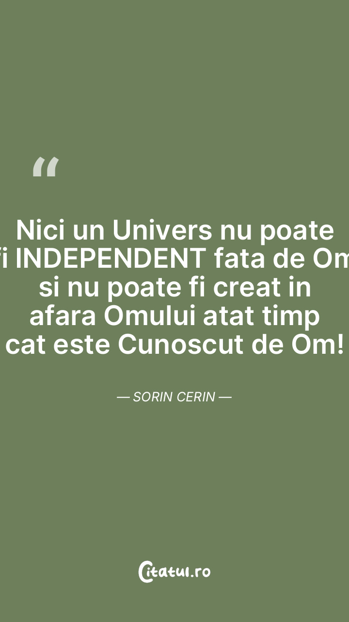 Nici un Univers nu poate fi INDEPENDENT fata de Om si nu poate fi creat in afara Omului atat timp cat este Cunoscut de Om! Sorin Cerin