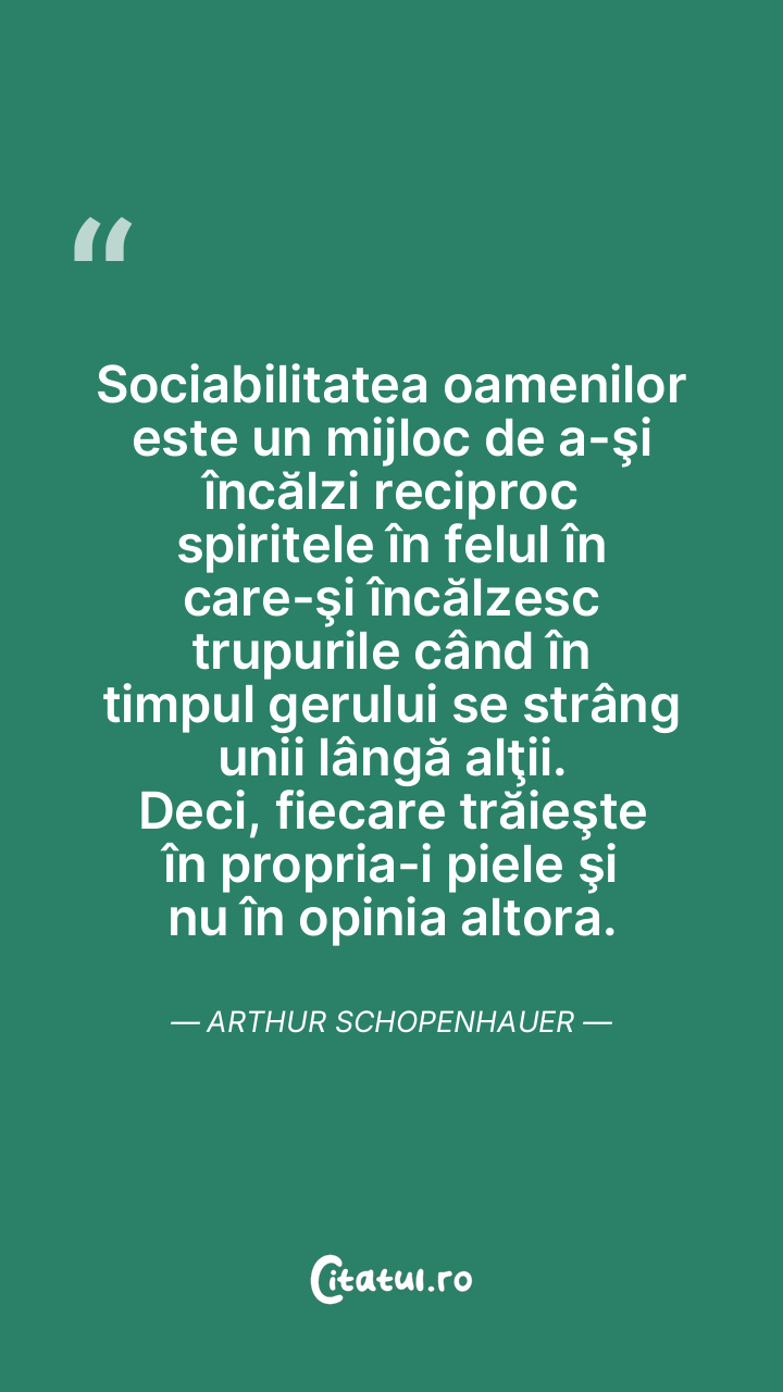 Sociabilitatea oamenilor este un mijloc de a-şi încălzi reciproc spiritele în felul în care-şi încălzesc trupurile când în timpul gerului se strâng unii lângă alţii. Deci, fiecare trăieşte în propria-i piele şi nu în opinia altora. Arthur Schopenhauer