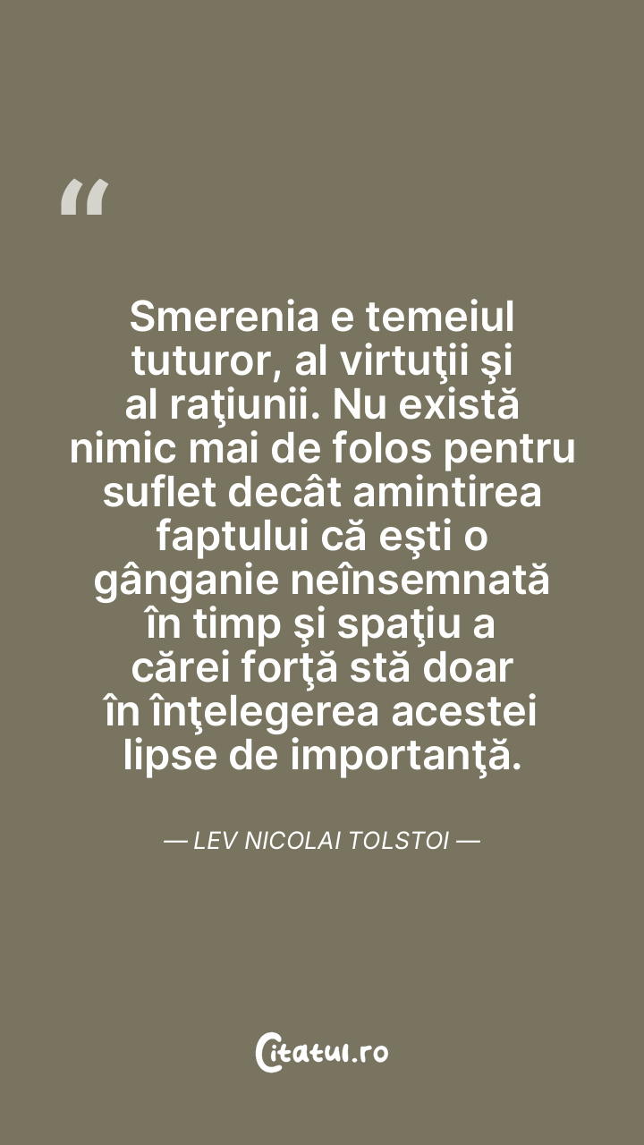 Smerenia e temeiul tuturor, al virtuţii şi al raţiunii. Nu există nimic mai de folos pentru suflet decât amintirea faptului că eşti o gânganie neînsemnată în timp şi spaţiu a cărei forţă stă doar în înţelegerea acestei lipse de importanţă. Lev Nicolai Tolstoi