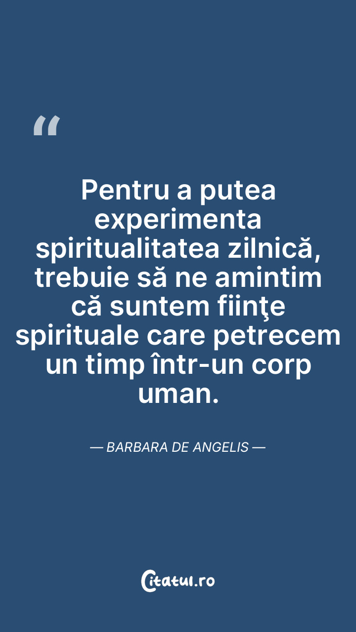 Pentru a putea experimenta spiritualitatea zilnică, trebuie să ne amintim că suntem fiinţe spirituale care petrecem un timp într-un corp uman. Barbara De Angelis