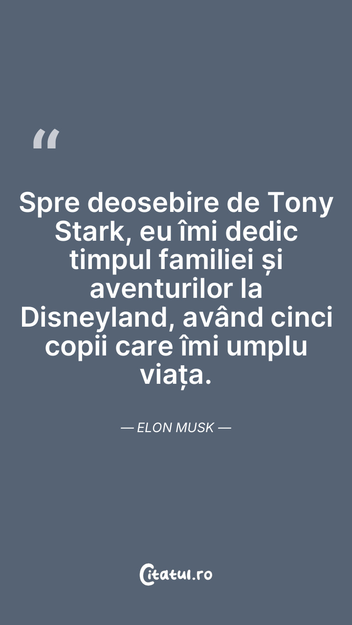 Spre deosebire de Tony Stark, eu îmi dedic timpul familiei și aventurilor la Disneyland, având cinci copii care îmi umplu viața. Elon Musk