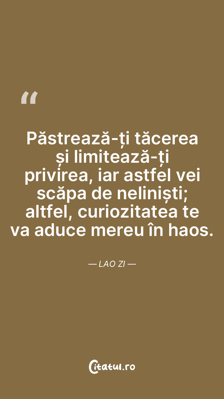 Păstrează-ți tăcerea și limitează-ți privirea, iar astfel vei scăpa de neliniști; altfel, curiozitatea te va aduce mereu în haos. Lao Zi