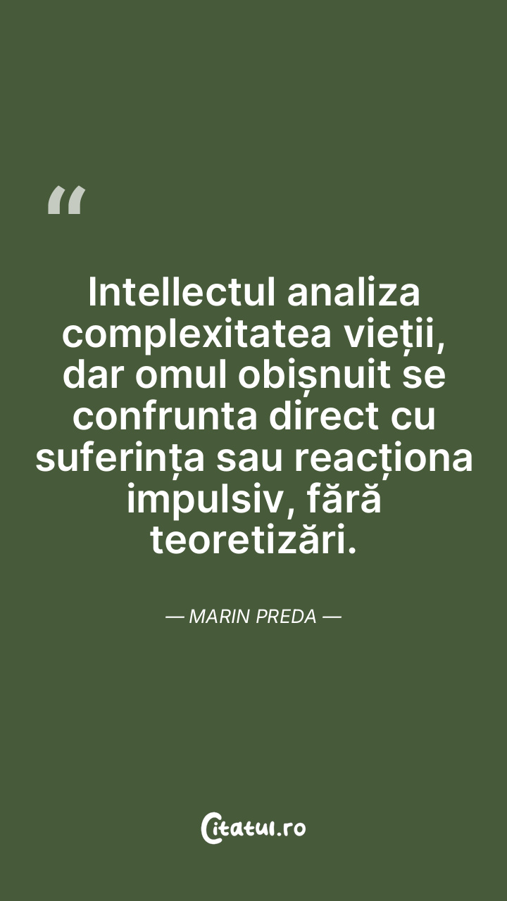 Intellectul analiza complexitatea vieții, dar omul obișnuit se confrunta direct cu suferința sau reacționa impulsiv, fără teoretizări. Marin Preda