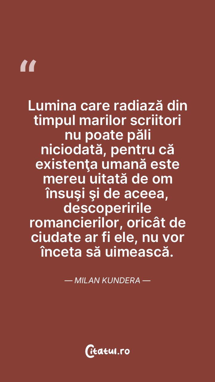 Lumina care radiază din timpul marilor scriitori nu poate păli niciodată, pentru că existenţa umană este mereu uitată de om însuşi şi de aceea, descoperirile romancierilor, oricât de ciudate ar fi ele, nu vor înceta să uimească. Milan Kundera